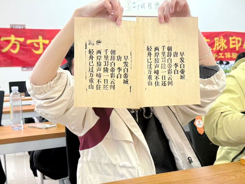 在实践体验环节,同学们分为若干小组,亲手体验活字印刷的完整流程。从仔细挑选心仪的诗词字模,到在字盘里按顺序排列组合,再用刷子蘸取墨汁均匀涂抹,最后铺上宣纸轻轻按压,每一个步骤都需要耐心与细致。当一幅幅带着墨香的诗词作品从自己手中“诞生”时,大家纷纷拿起作品拍照留念,感受着传统文化带来的独特乐趣。