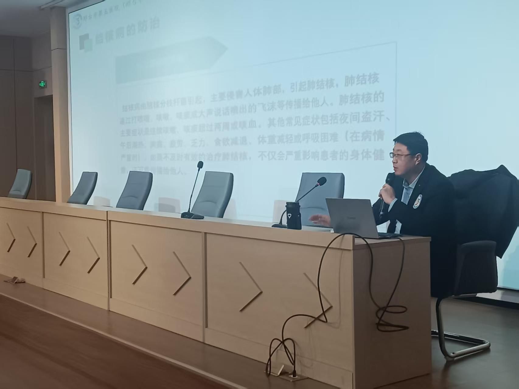 讲座由孙金陶主任主讲。他首先详细讲解了结核病的防治知识,明确指出结核病是由结核分枝杆菌引起的慢性呼吸道传染病,肺部为主要侵害部位,而我国作为全球结核病高负担国家之一,校园人群因聚集性强,防控工作尤为关键。孙主任从传播途径、易感人群、早期典型症状、临床诊断方法及规范治疗方案等方面进行全方位解读,着重强调 “早发现、早诊断、早治疗” 的核心原则,同时倡导师生养成规律作息、均衡饮食、加强体育锻炼的良好生活习惯,从根源上提高自身免疫力。