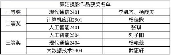 为深入推进校园廉洁文化建设,营造风清气正的育人环境,培养学生的廉洁意识和道德品质,树立清正廉洁的的价值理念。信息工程系举办:“清风满校园,廉洁沁人心”为主题的摄影、微视频作品征集活动已圆满收官。