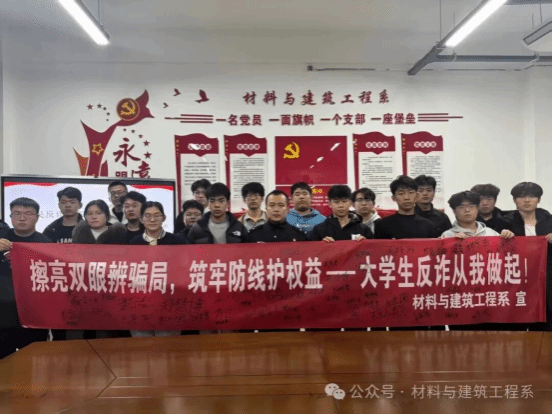 此次反诈知识主题讲座,既让学生系统掌握了反诈知识与应对技巧,有效提升识诈防诈能力,更强化了青年群体的社会责任感与担当意识。未来,材料与建筑工程系将持续推进反诈宣传教育常态化,引导学生成为反诈行动的积极实践者与主动传播者,携手营造“人人识诈、人人防诈、人人反诈”的浓厚校园氛围,为平安校园与和谐社会建设筑牢坚实基础。