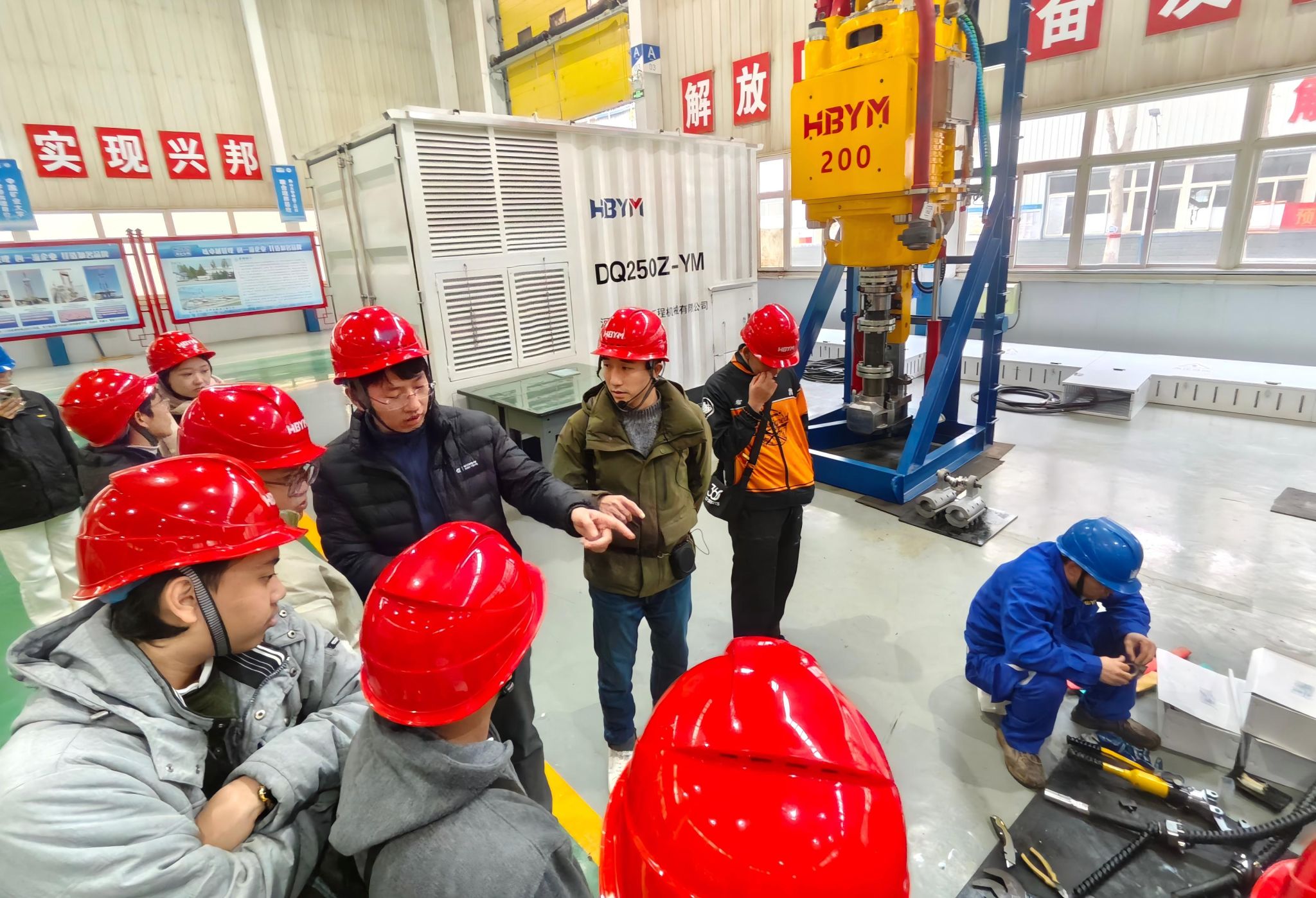 在河北永明地质工程机械有限公司厂区,留学生们头戴安全帽,深入钻具生产、顶驱钻机装配车间参观。聚焦大型地质工程机械装备制造,企业技术骨干详细介绍产品零部件生产、自动线加工质检、机械电气装配与测试等企业生产过程,现场讲解生产的工艺、设备操作原理。通过结合近距离技术观摩,以及与企业工程师直接交流答疑解惑的沟通环节,让留学生对中国高端装备制造的实力有了更加深刻的直观认知。