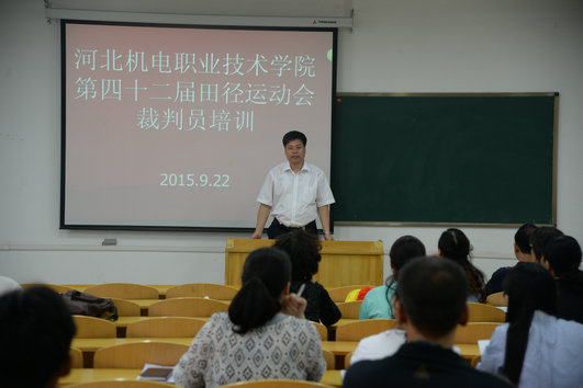 9月22日 下午,在教学楼B313召开了我院第四十二届田径运动会裁判员培训会,学院副院长张兆隆,教务处处长赵双全,体育工作部部长张平出席会议,全体裁判员参加了会议。 赵双全处长主持并宣布了全体裁判员的裁判项目,...