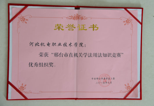 近日,由市直工委主办的2015年邢台市直机关党员干部学法用法知识竞赛圆满结束,全市共评出“优秀组织奖”20个,我院在此次活动中高度重视,精心组织,积极参与,参赛成绩好,被授予“优秀组织奖”。 我院以此次竞赛活动为契机,...